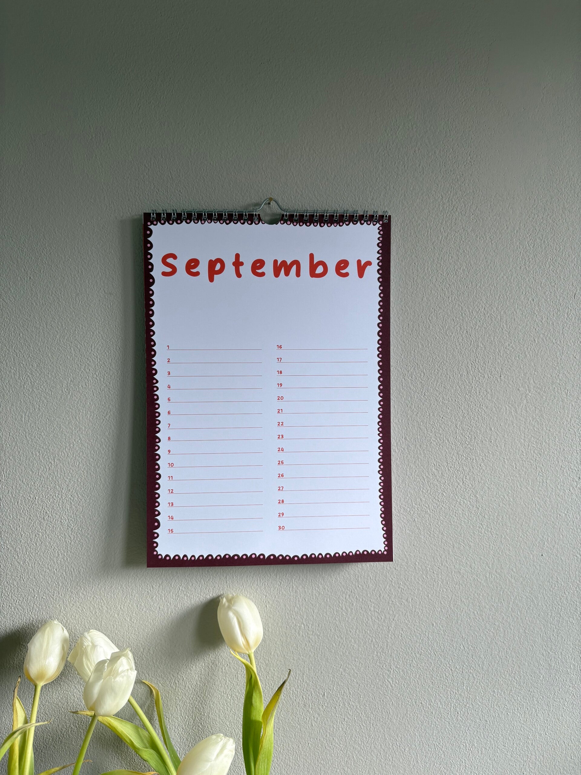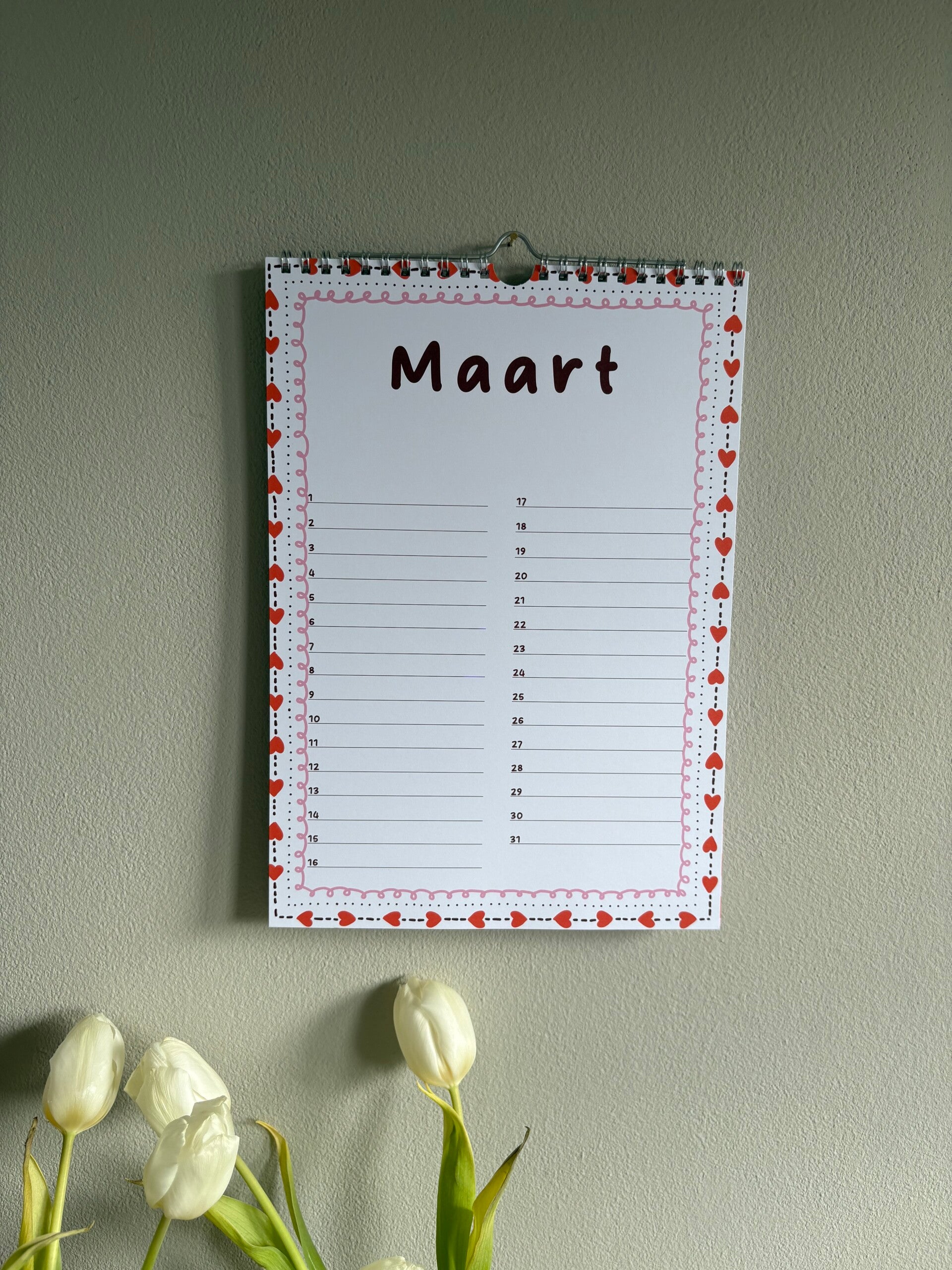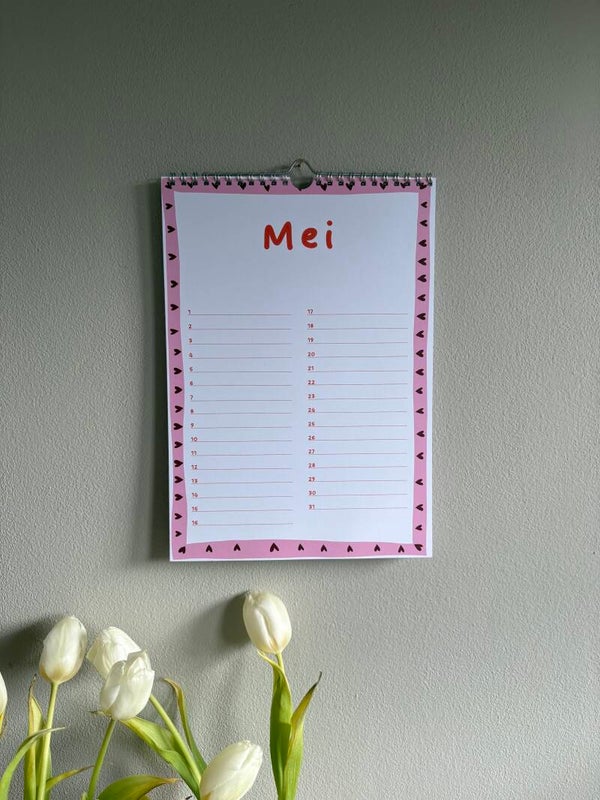 Houd alle verjaardagen overzichtelijk bij met deze stijlvolle verjaardagskalender in A4-formaat. Elke maand heeft een eigen, uniek ontwerp met een vrolijke en zachte uitstraling in warme rood- en roze tinten. De speelse typografie en subtiele details, zoals hartjes en decoratieve randen, geven de kalender een lieve en moderne look die mooi staat in elk interieur.